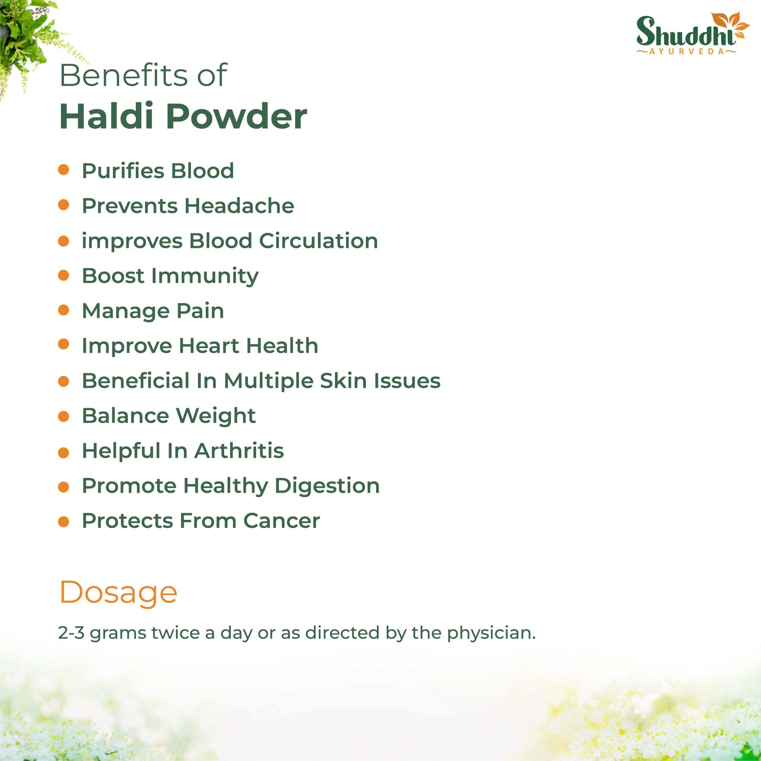 Haldi Powder is made up of Haldi (Curcuma Longa). Haldi is a potent anti-inflammatory, antioxidant, and natural antibiotic popularly known for its medicinal qualities in Ayurveda. It has many scientifically proven health advantages, such as the potential to improve heart health, prevent prostate cancer, manages cholesterol, strengthen ligaments, beneficial in arthritis, helpful in Alzheimer’s, detoxifies the liver, blood, and body.