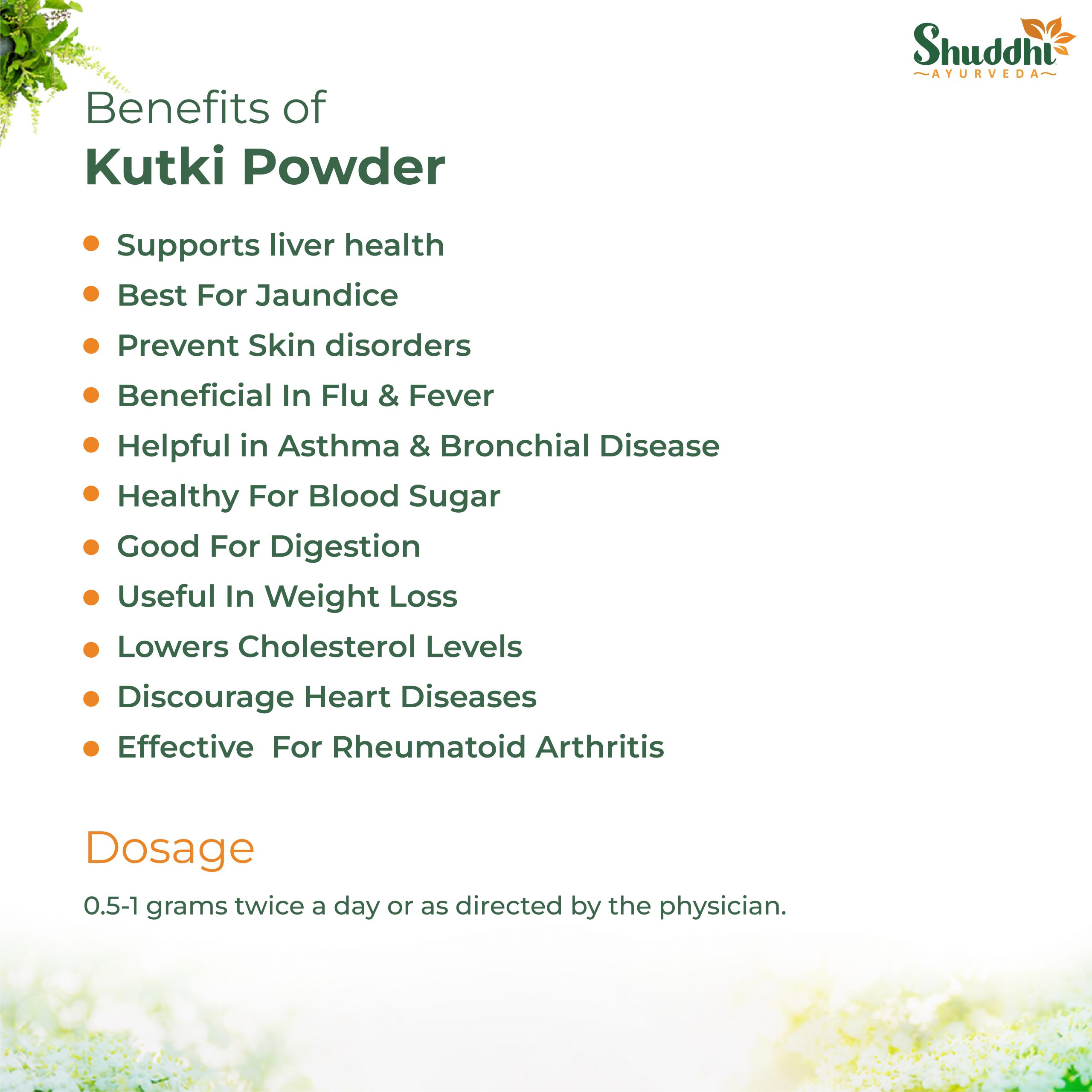 Kutki Powder is made up of Kutki (Picrorhiza Kurroa). Kutki is one of the best Ayurvedic medicines and is primarily known for its cooling effect. Moreover, it may be used as a cardiotonic, antipyretic, anthelmintic, and laxative. It is also best for Diabetes, Blood Disorders, Jaundice, Liver and Spleen disorders, skin disorders, and relieve stomachache to promote appetite. In addition, Kutki is useful in Kapha, Urinary discharge, burning sensations, leucoderma.