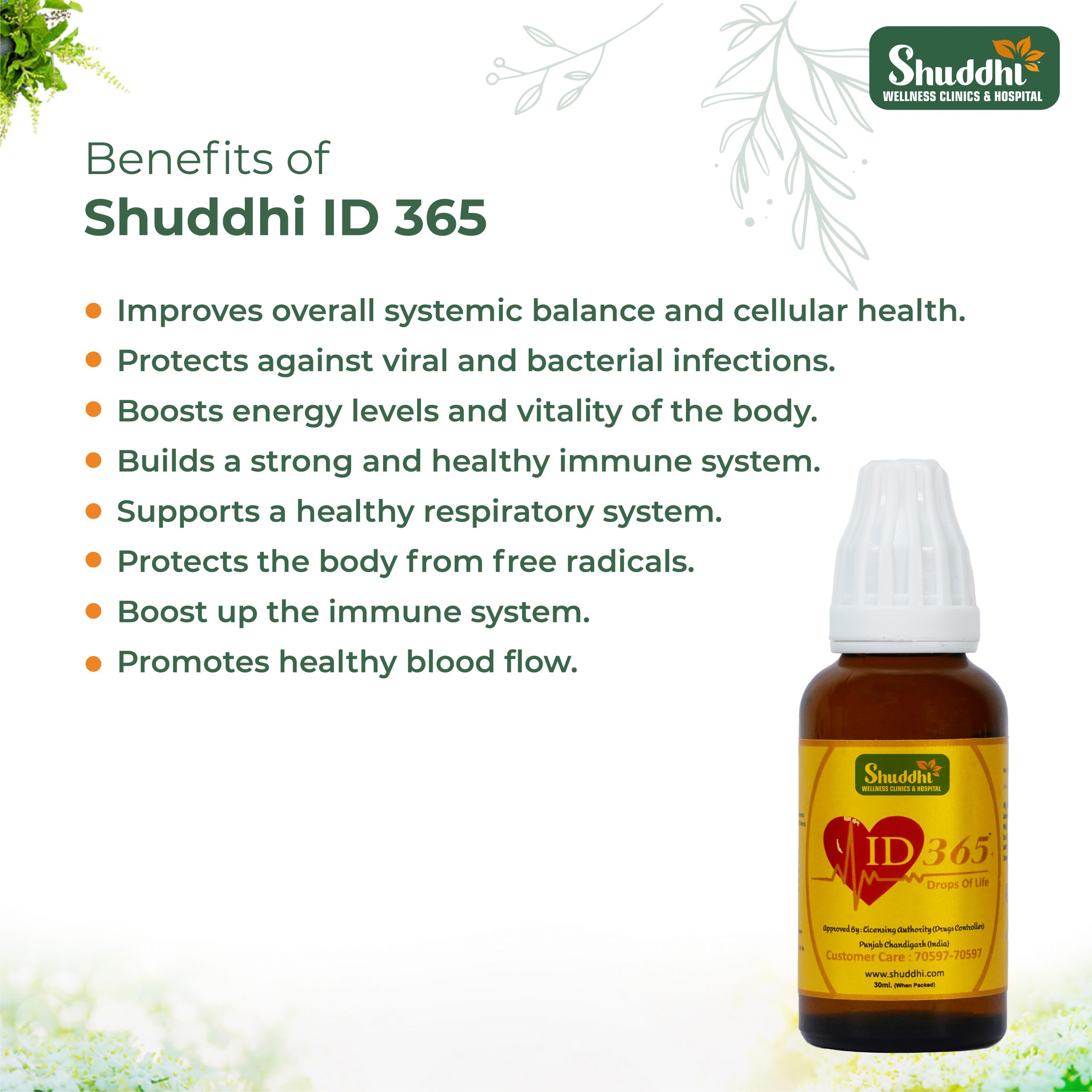 ID-365 are the immunity drops that help in boosting our immune system. It works by stimulating and building immunity against nervous stress, blood -pressure, sugar, thyroid, skin diseases, etc. Ingredients in ID-365 act as a powerful support for your immune system and ensure your overall well-being.