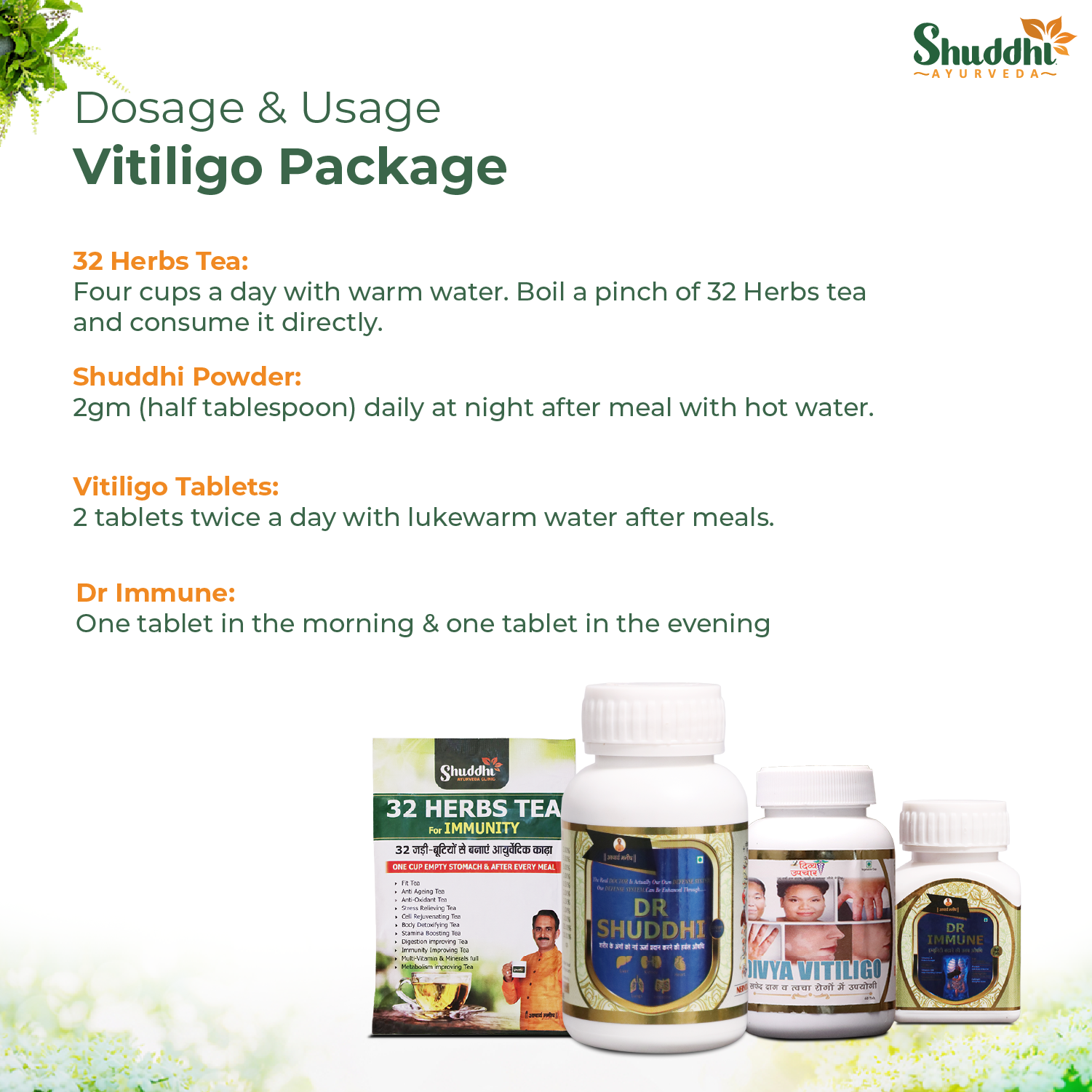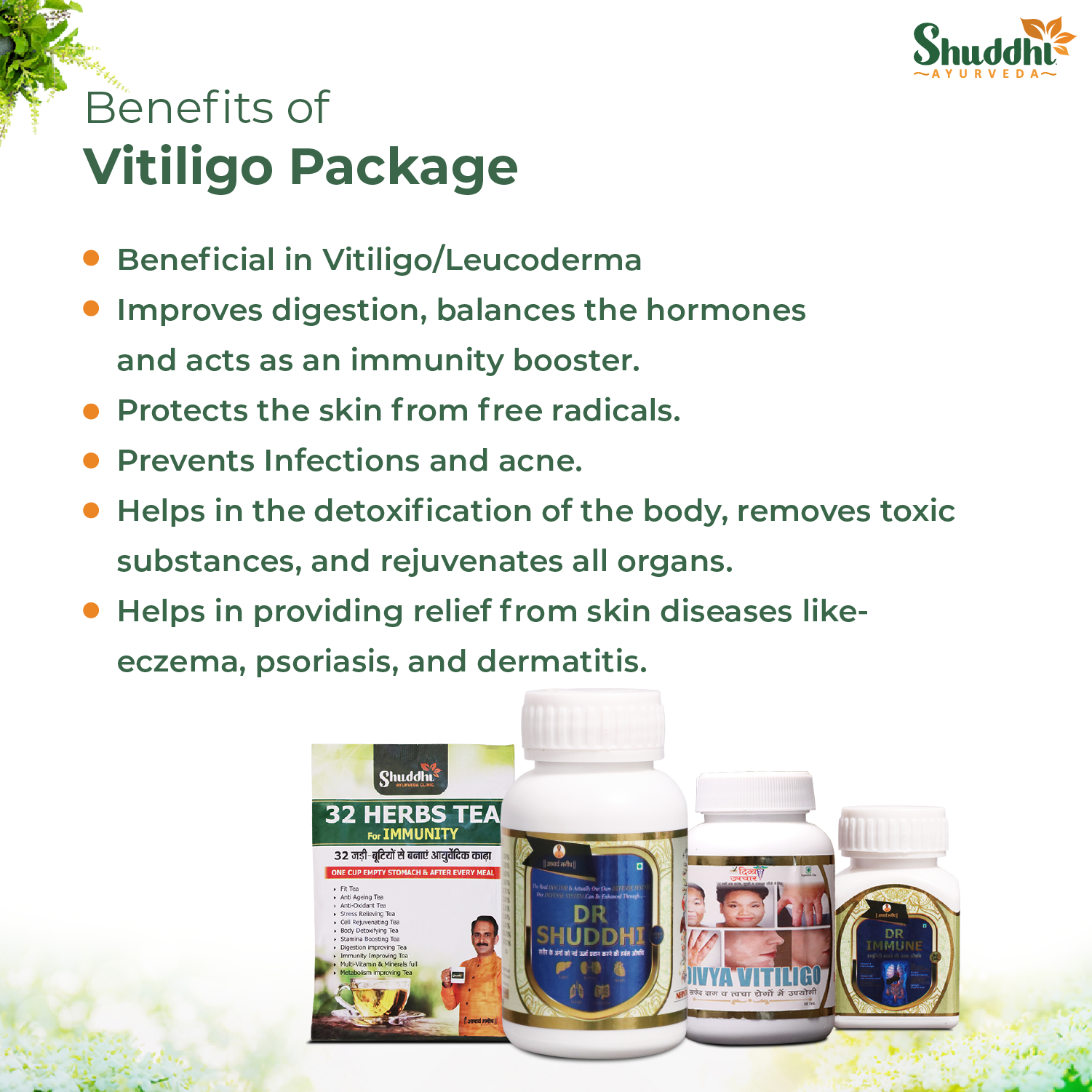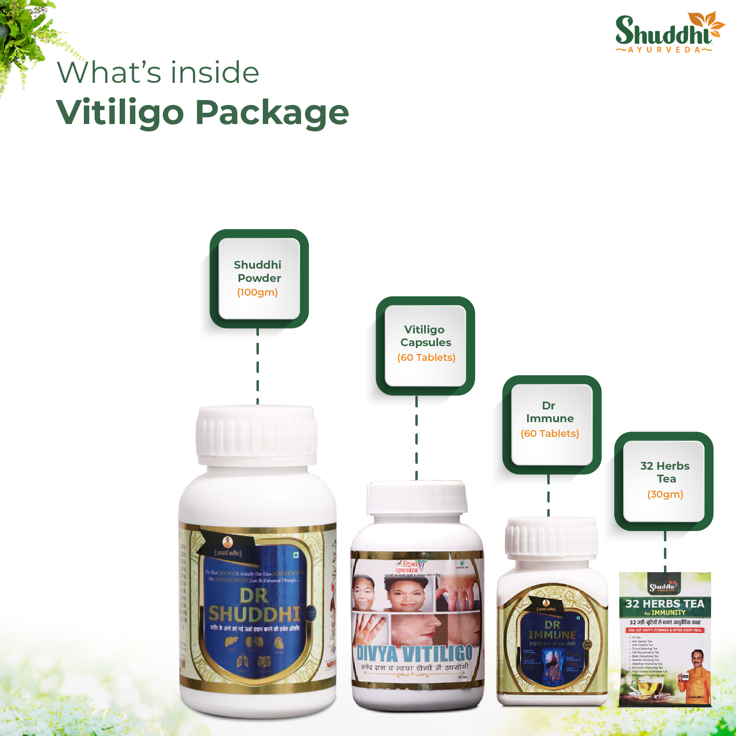 Shuddhi Vitiligo package is an ayurvedic herbal package that is beneficial in vitiligo and leucoderma diseases. The package comes with the Vitiligo tablets, Dr Immune, Dr Shuddhi Powder and 32 Herbs Tea. All these products of Shuddhi Vitiligo packages are the combination of various herbs. There are no side effect of this package.